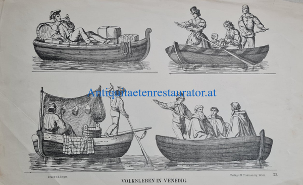 "Volksleben in Venedig.". Die Druckgrafik wurde von E. Singer (Eduard Singer 1810-1876) erstellt und im Verlag M. Trentsensky in Wien veröffentlicht.