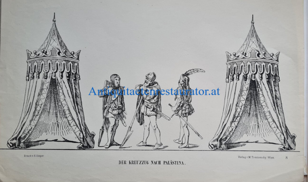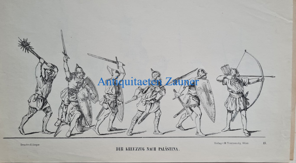 "Kreuzzug nach Palästina". Die Druckgrafik wurde von E. Singer (Eduard Singer 1810-1876) erstellt und im Verlag M. Trentsensky in Wien veröffentlicht.