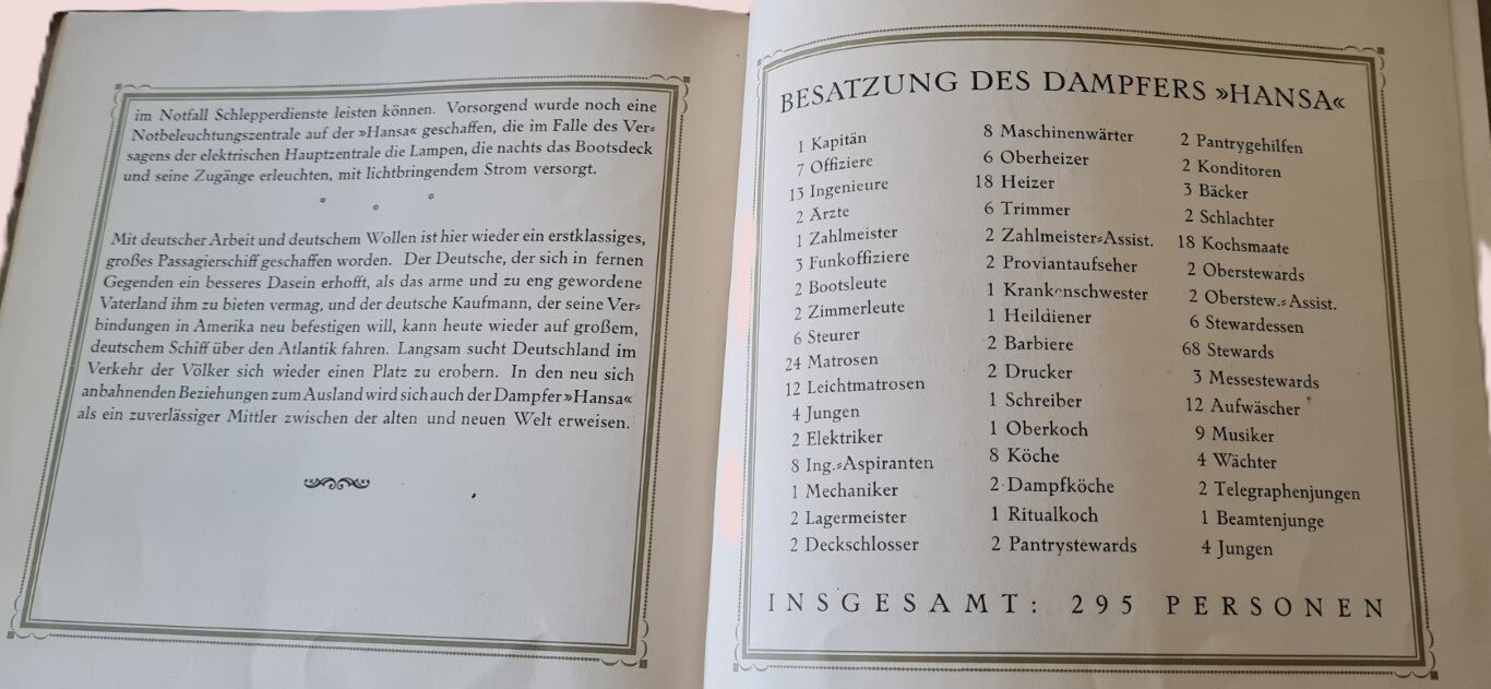 Werbe- oder Informationsbroschüre der Hamburg-Amerika Linie (HAPAG) aus der Mitte der 1930er Jahre. 30 seitiges Heft über den Dampfer Hansa (ehemals Albert Ballin) mit Abbildungen von technischen Annehmlichkeiten und Eleganz der Räumlichkeiten des Schiffes. Ebenso eine Liste des Bordpersonals